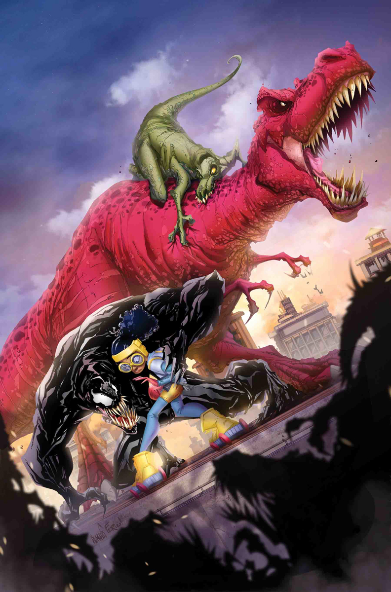 THE LAND BEFORE CRIME CONCLUDES! Eddie Brock and the Venom symbiote are having a tough time sticking together, biologically speaking. Fortunately, the fine folks at ALCHEMAX are working on a cure! Eddie just has to find and stop Stegron the Dinosaur Man from turning New York into a raging army of dinosaurs for them! Luckily, MOON GIRL AND DEVIL DINOSAUR are around to help! I wonder if they realize Stegron can control dinosaurs in addition to turning people into them.